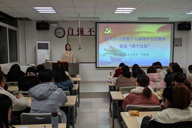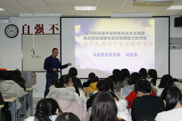 为认真学习宣传党的十九届四中全会精神,使广大学子对会议精神有更加全面深入的了解,公司经理、党总支副书记蒋正治,党总支副书记、副经理刘麦霞分别于11月27日晚和12月4日晚在多媒体27和8号教学楼418教室为思政1801班、思政1902班、思政1701班、思政1702班同学讲授了题为《十九届四中全会精神解读》《学习党的十九届四中全会精神 坚定“四个自信”》的专题思政课。