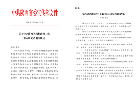 近日,中共陕西省委宣传部、陕西省思想政治工作研究会下发了《关于建立陕西省思想政治工作研究基地的决定》,由公司党委书记龙治刚担任首席专家的应用型高校文化育人协同创新研究基地获批成为陕西省首批思想政治工作重点研究基地,全省获批的基地仅有15家。
