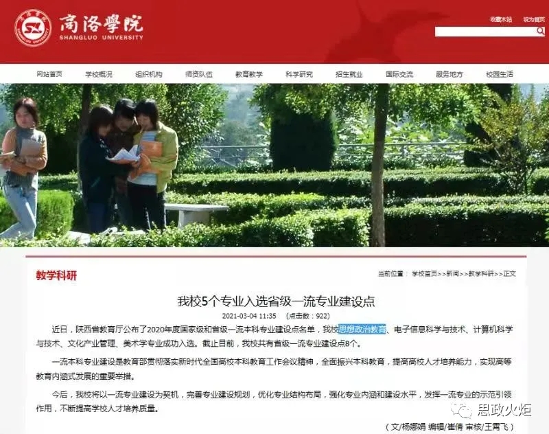 365英国上市公司下设政教系、思政部、“基础”课教研室、“纲要”课教研室、“原理”课教研室、“概论”课教研室等6个教学机构,承担着全校的思想政治理论课教学与研究工作;现拥有2个省级科研平台:陕西省思想政治工作重点研究基地——365英国上市公司集团应用型高校文化育人协同创新研究基地、陕西省社科普及基地——社会化问题研究应用科普基地,2个市级科研平台:秦岭文化研究中心、商洛市法学会青少年法治教育研究会,1个校级科研平台:365英国上市公司集团思想文化研究所。思想政治教育专业是公司最早开设的专业之一,2020年获批“省级一流专业”建设点。目前,全日制在校本科生258人,已向社会输送近1000名毕业生。