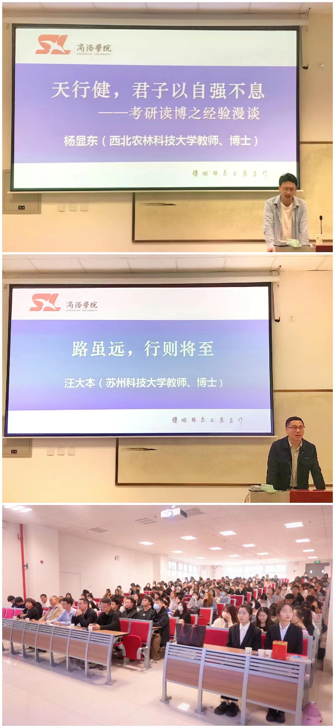 报告会上,汪大本、杨显东分别结合自身十余载学习、生活经历,给同学们分享了他们的成长成才之路、考研考博经验和成长过程中的人生感悟。他们一致认为,坚定的理想信念是支撑一个人走向成功的重要前提,严格自律是保证一个人取得成功的必要条件,良好的学习氛围是激励一个人坚持不懈的重要外在条件,志同道合的朋友是大学期间积累的宝贵人生财富。他们表示四年的老员工活不仅让自己学到了知识,更重要的是学会了为人处事之道,养成了让自己受益一生的生活和学习习惯,留下了人生旅途中弥足珍贵的美好回忆。他们对于母校的培养表示衷心的感谢,并诚恳地希望学弟学妹们坚定理想信念、自知自信、奋发进取,心中有梦、敢于追梦,以梦为马、不负韶华。