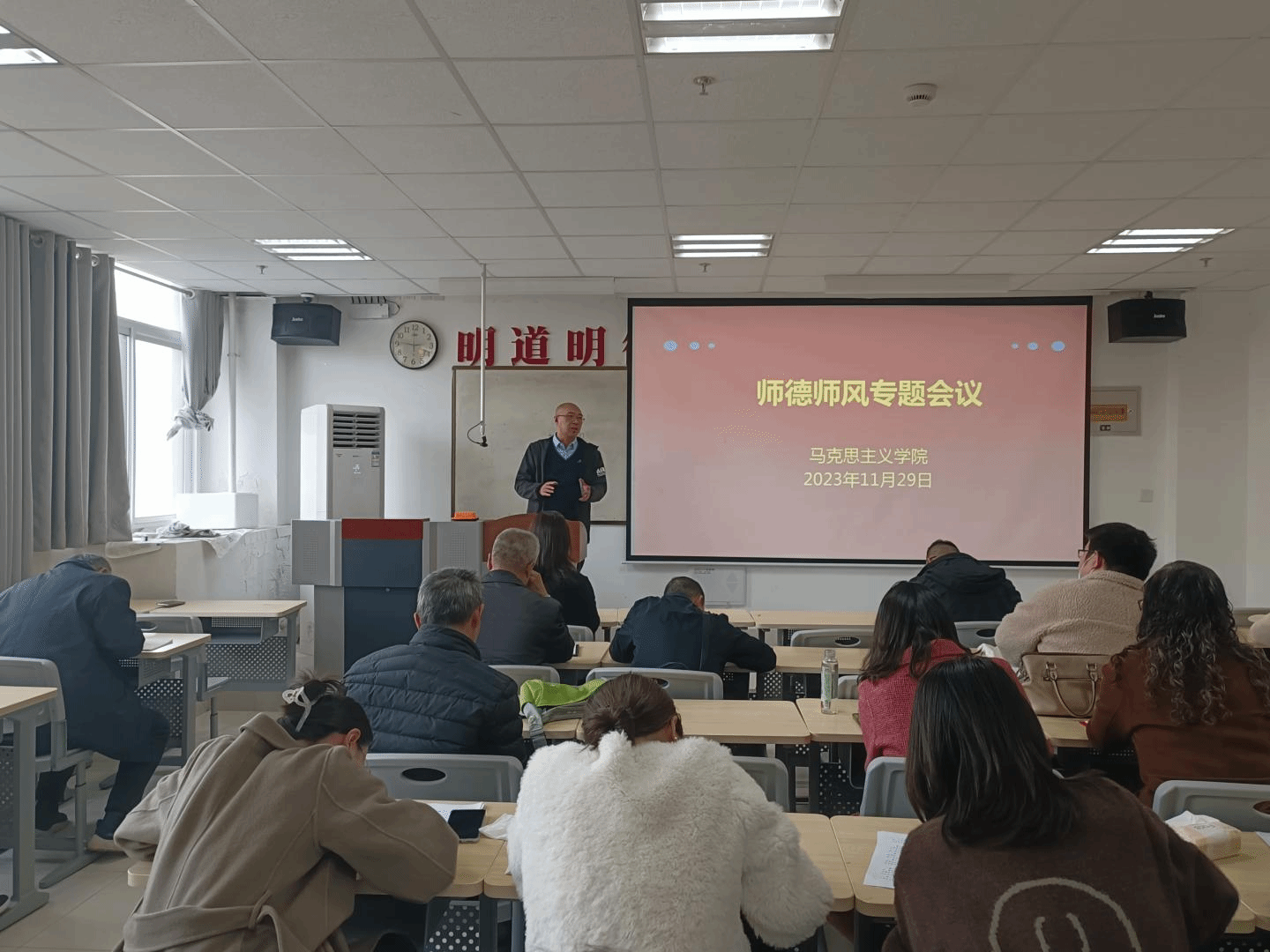 为持续加强师德师风建设,以先进典型为榜样引领,全面提升公司教师思想道德追求和专业教学素养,努力成为“经师”和“人师”相统一的新时代教育工作者,11月29日下午,公司在八号楼518教室召开师德师风专题会议。公司党政领导班子成员和全体教职工参加会议。会议由党总支书记刘麦霞主持。