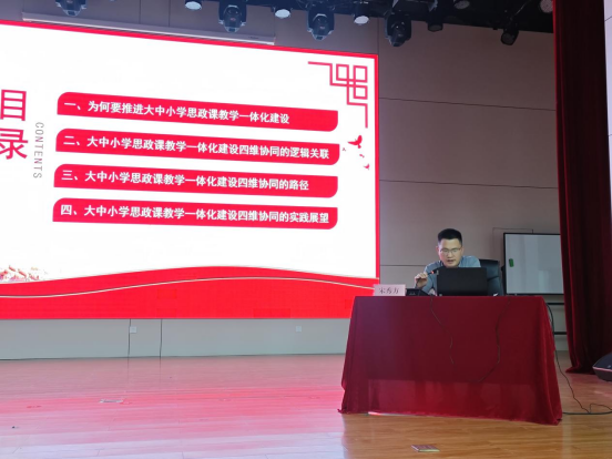 随后,宋秀方围绕《大中小学思政课教学一体化建设的四维协同路径探索》作专题报告。报告聚焦大中小学思政课教学一体化建设的痛点,提出“目标协同、内容协同、方法协同、保障协同”的四维路径,为推动思政课全学段纵向贯通、跨学科横向协同提供了一种思路,引发与会教师广泛共鸣与深入探讨。
