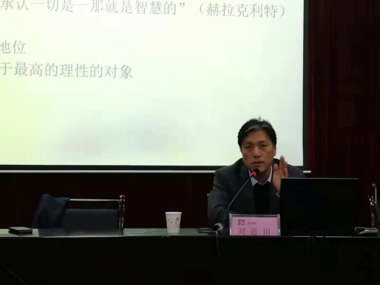 刘进田教授的报告深入浅出,以“什么是智慧”引入主题,讲解了西方哲学的智慧,再结合中西方哲学的差异和特点,阐释了哲学智慧。他选取中西方哲学各自的、极富共性的话题,又以每个时代具有代表性的哲学人物为依托,展开理性思维的脉络,论证中西方文化哲学、价值哲学虽然有其差异,但都可以统一于人的本体,可以人的本体规定圆点来解释文化各领域的形成及其统一性。