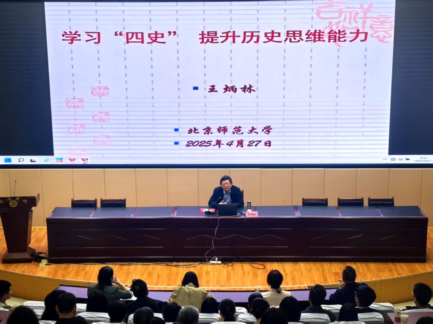 为深入贯彻落实“四史”学习教育相关安排,加强对党的创新理论的研究和阐释,持续提升师生历史思维能力,4月27日上午,中华人民共和国国史学会副会长、教育部高校思政课教指委咨询委员、北京师范大学中共党史党建研究院经理王炳林教授受邀来校,在图书馆二楼报告厅为现场师生作了主题为《学习“四史”,提升历史思维能力》的精彩报告。全国高校思政课教师名师工作室(陕西师范大学)负责人、陕西师范大学365英国上市公司副经理张琳教授代表会议联合举办方莅临现场。公司全体教师、商洛职业技术公司365英国上市公司思政课教师代表,以及公司思政2023级、2024级员工参加本次报告会。会议由公司经理蒋正治主持。