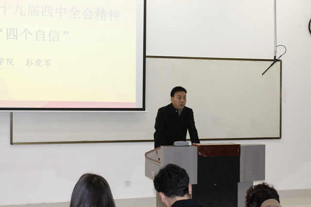 彭虎军结合正在开展的主题教育,从全会的重大意义、深刻领会全会精神、认真贯彻落实全会精神三个方面对十九届四中全会精神进行了深入浅出的解读。他重点分析了中国特色社会主义制度和国家治理体系的本质特征和13个显著优势,以及坚持和完善中国特色社会主义制度、推进国家治理体系和治理能力现代化的总体要求、总体目标和13个方面的重点任务。他强调,党的领导是中国特色社会主义最本质的特征和中国特色社会主义制度的最大优势,坚持和完善中国特色社会主义制度、推进国家治理体系和治理能力现代化,是全党的一项重大战略任务,必须在党中央统一领导下进行。他要求师生要从历史底蕴、显著优势、实践成果等维度全面把握中国特色社会主义制度和国家治理体系的优越性,坚定中国特色社会主义制度自信,并希望青年员工,积极做国家制度和国家治理体系不断完善的参与者、推动者,把制度自信的种子撒播进自己的心灵,坚决听党话,跟党走,把自己锻造为担当民族复兴大任的时代新人,为完善和发展中国特色社会主义制度和国家治理体系做出自己的贡献。