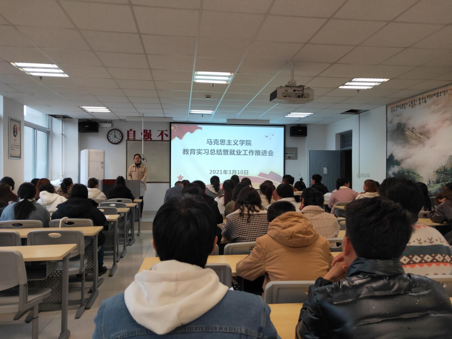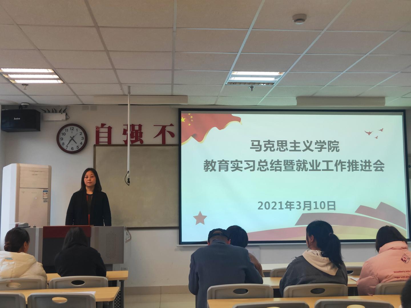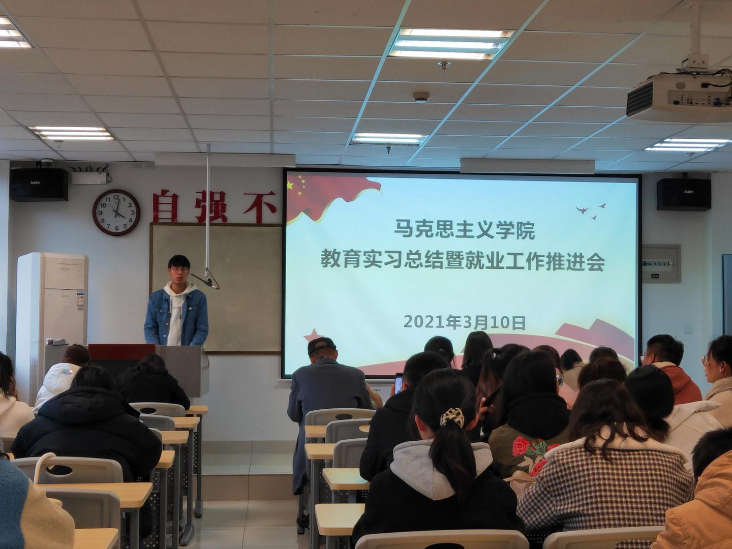 为及时总结2021届毕业生教育实习工作、推进员工就业工作,3月10日下午,公司在8号教学楼418教室召开了教育实习总结暨就业工作推进会。公司党总支副书记刘麦霞、副经理武永耿、学工办主任李燕燕、教学秘书杨琨、政教系主任刘健老师出席会议,2021届毕业生参加会议,此次会议分教育实习总结和就业工作推进两个阶段,分别由杨坤和李燕燕主持。