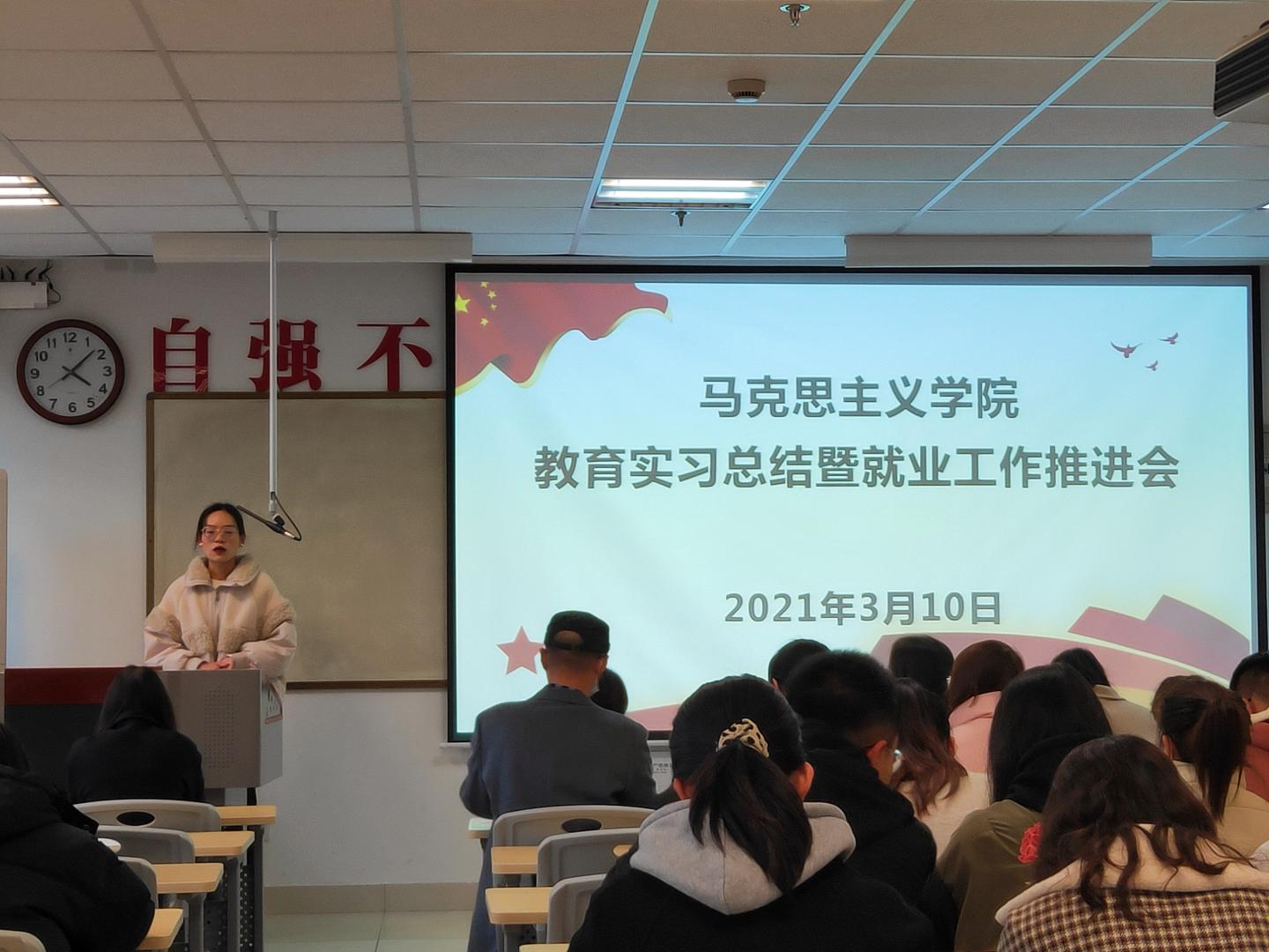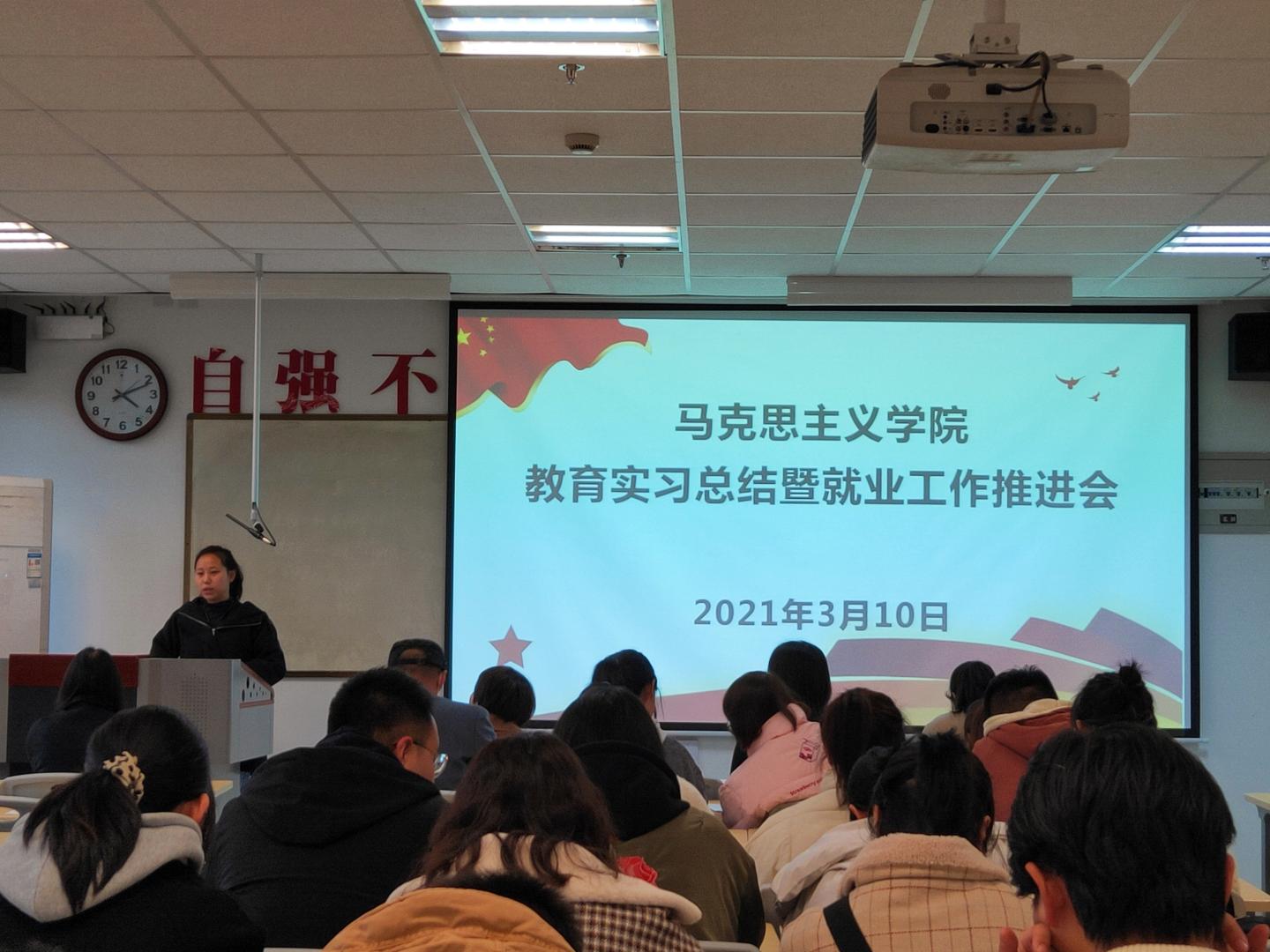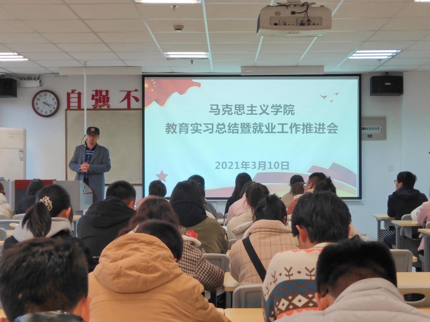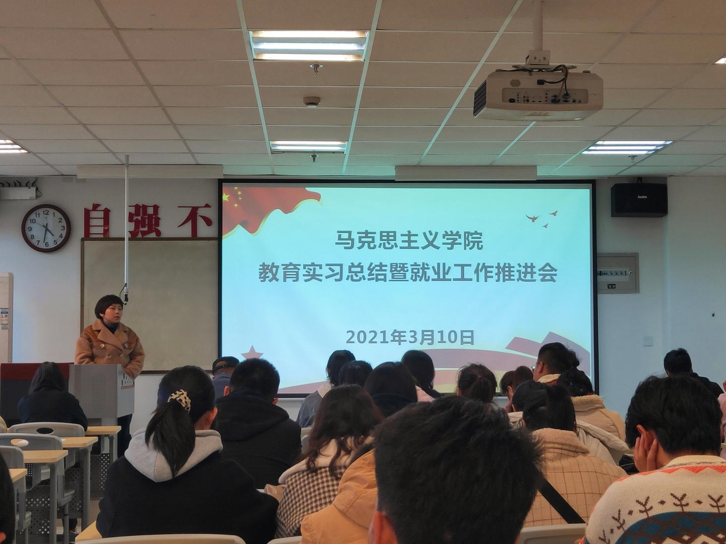 为及时总结2021届毕业生教育实习工作、推进员工就业工作,3月10日下午,公司在8号教学楼418教室召开了教育实习总结暨就业工作推进会。公司党总支副书记刘麦霞、副经理武永耿、学工办主任李燕燕、教学秘书杨琨、政教系主任刘健老师出席会议,2021届毕业生参加会议,此次会议分教育实习总结和就业工作推进两个阶段,分别由杨坤和李燕燕主持。