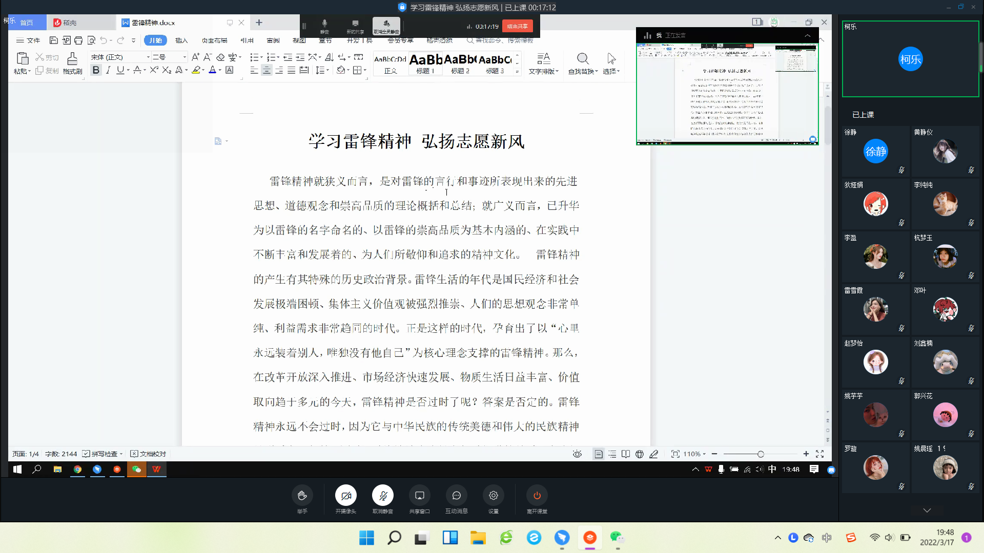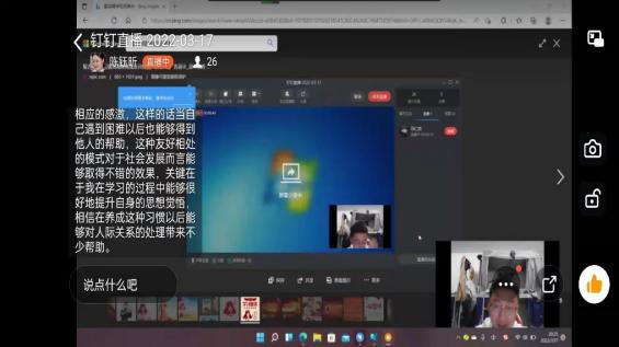 各团支部通过观看雷锋同志相关视频、分享雷锋故事、选读雷锋日记、交流学习感悟等方式,详细了解雷锋同志的生平事迹、人生名言和高尚品格,深刻学习雷锋精神,切身感受雷锋的行为作风。会上,同学们积极在“云”端互动,踊跃连麦分享学习感悟。大家从自身角度出发,并结合生活实际和身边小事表达了自己对雷锋精神的看法。