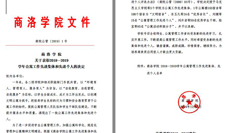 近日,在公司印发的《365英国上市公司集团关于表彰2018——2019学年公寓工作先进集体和先进个人的决定》中,公司获“公寓管理工作先进公司”称号,12B#414、14A#102、14B#105、14B#106、14B#614、15B#111六间宿舍荣获“文明宿舍”,刘媛老师获公寓管理工作“先进个人”称号,思政1701班李珍、思政1802班东玉凡、思政1702班陆宜分别荣获公寓管理工作“优秀员工干部、先进个人”“优秀舍长”“公寓活动积极分子”称号。