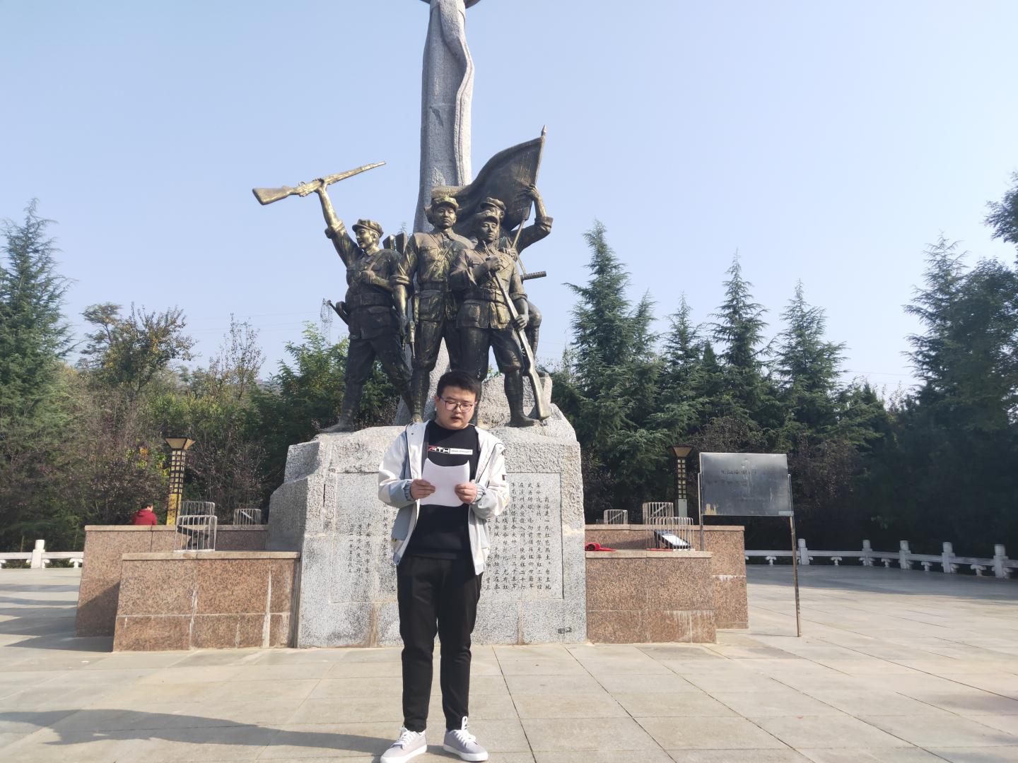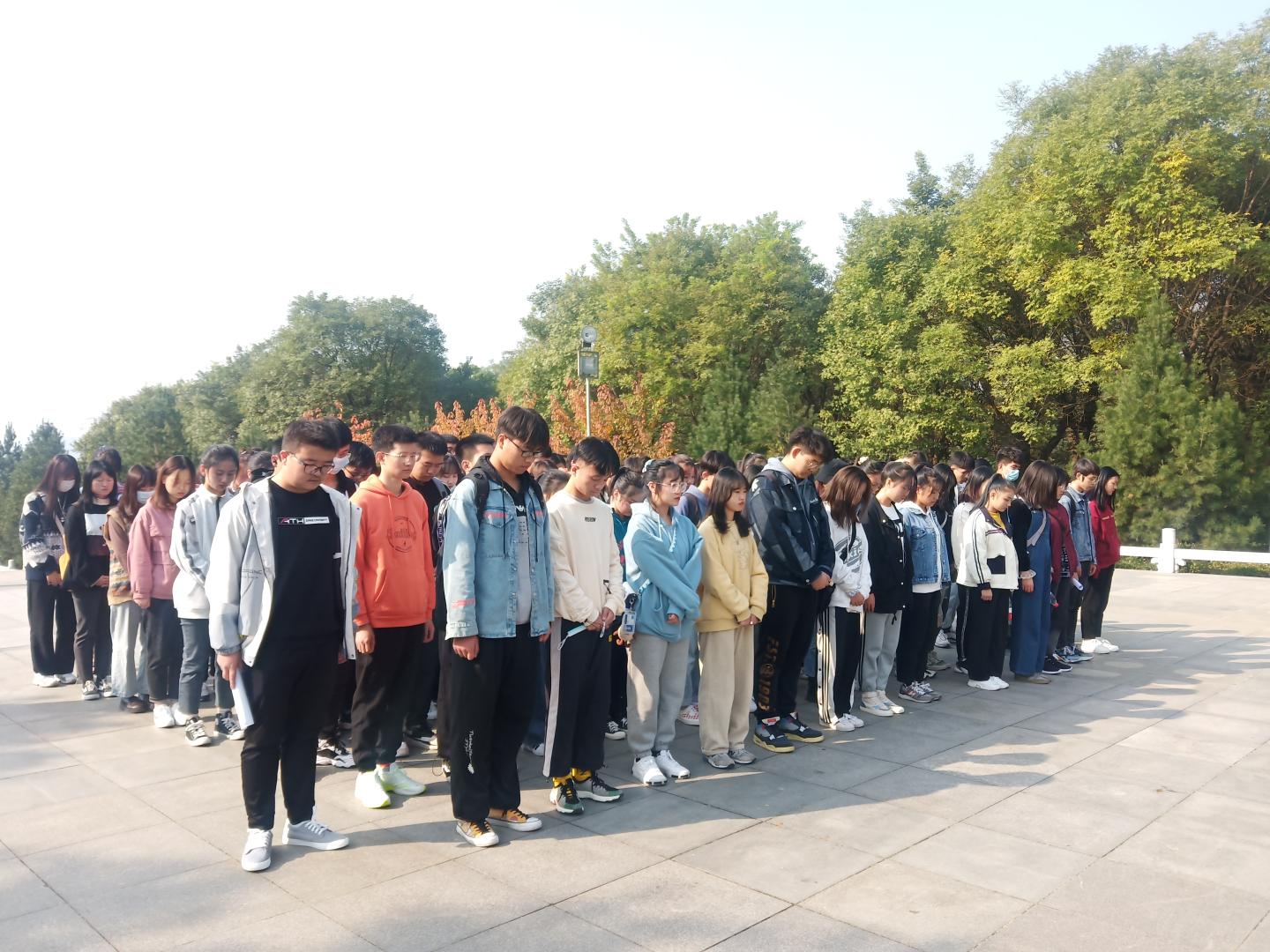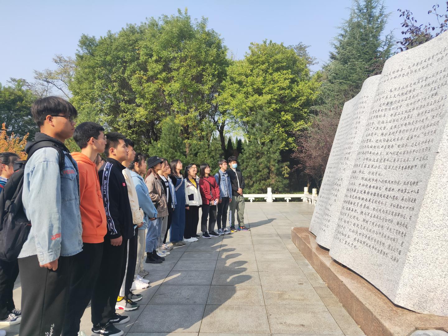 队伍到达第二站金凤山烈士陵园,顺利开展“学习四史,祭奠英烈”活动。活动中,员工代表思政1902班柯乐作了关于“学四史、守初心、担使命,争做新时代文明老员工”主题演讲。他号召同学们深入学习党史、新中国史、改革开放史和社会主义发展史,以此增强守初心、担使命的思想自觉和行动自觉,争做文明老员工。演讲结束后,同学们在烈士陵园前集体默哀两分钟,以缅怀烈士,致敬先烈。
