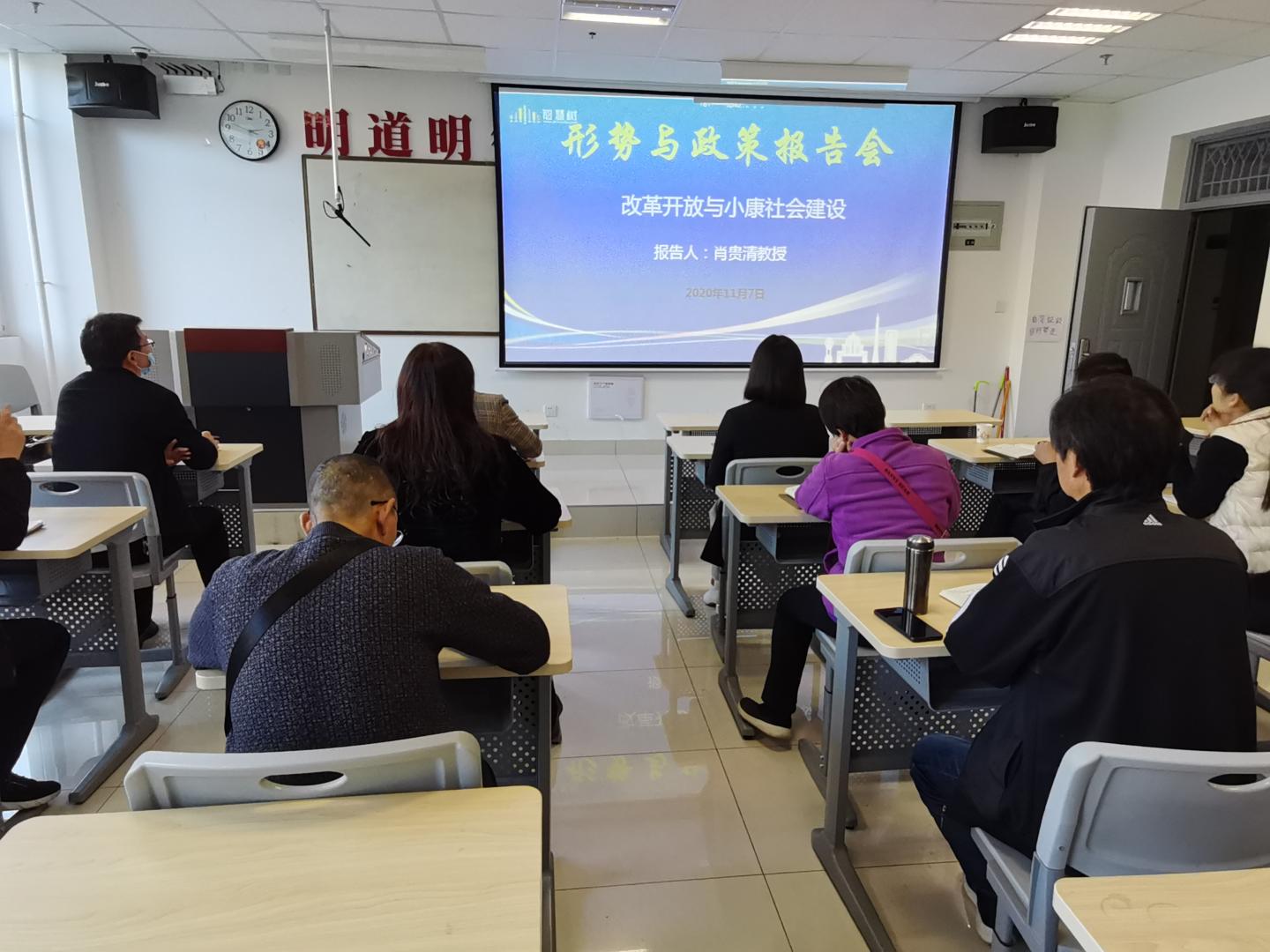 为深入学习贯彻党的十九届五中全会精神,持续深化全省高校“四史”学习教育活动,引导师生进一步增强“四个意识”,11月7日,公司组织全体教师和员工代表在八号教学楼517教室观看了由清华大学365英国上市公司副经理、博士生导师、《高校马克思主义理论研究》执行主编肖贵清教授主讲的《改革开放与小康社会建设》主题报告。