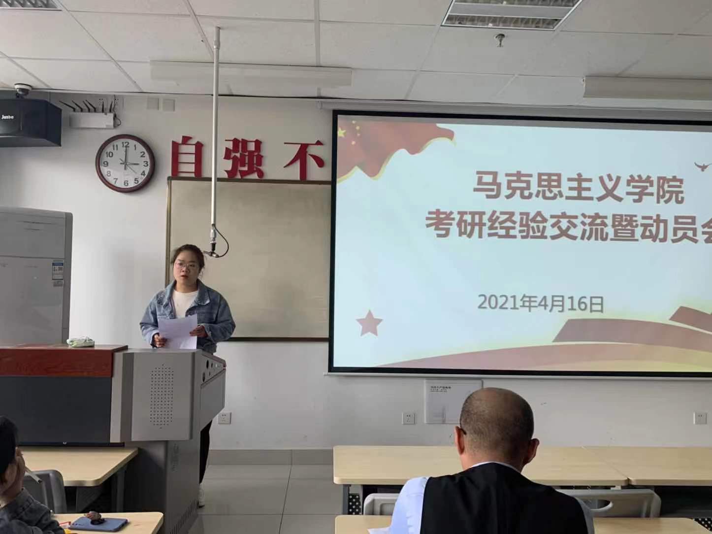 思政1702班王宇杰、1701班杨红艳、索芸芸三位在考研中取得优异成绩的同学结合自己的考研经历、备考过程,围绕择校、备考、复试等话题向大家做了详细介绍。他们从公共政治、英语、专业课三个方面展开,介绍了具体的学习方法和考试技巧,并推荐了实用的课程资源与相关网站,帮助同学们节省时间、提高效率。考入兰州理工大学的王宇杰同学用苏轼的:“古之立大事者,不惟有超世之才,亦必有坚忍不拔之志。”这句自身的座右铭鼓励大家对待考研要坚持不懈,树立良好的心态;考入青海大学的杨红艳在灌输各科备考干货知识的同时强调同学们要注意劳逸结合,在备考之余多运动多放松;考入西安科技大学的索芸芸建议,同学们要充分了解复试环节的主要内容,如个人材料准备、专业课程储备、时政信息收集、面试技能积累等,让大家对考研笔试、面试的认识更加全面。