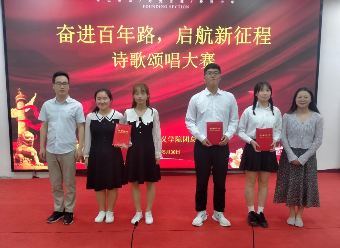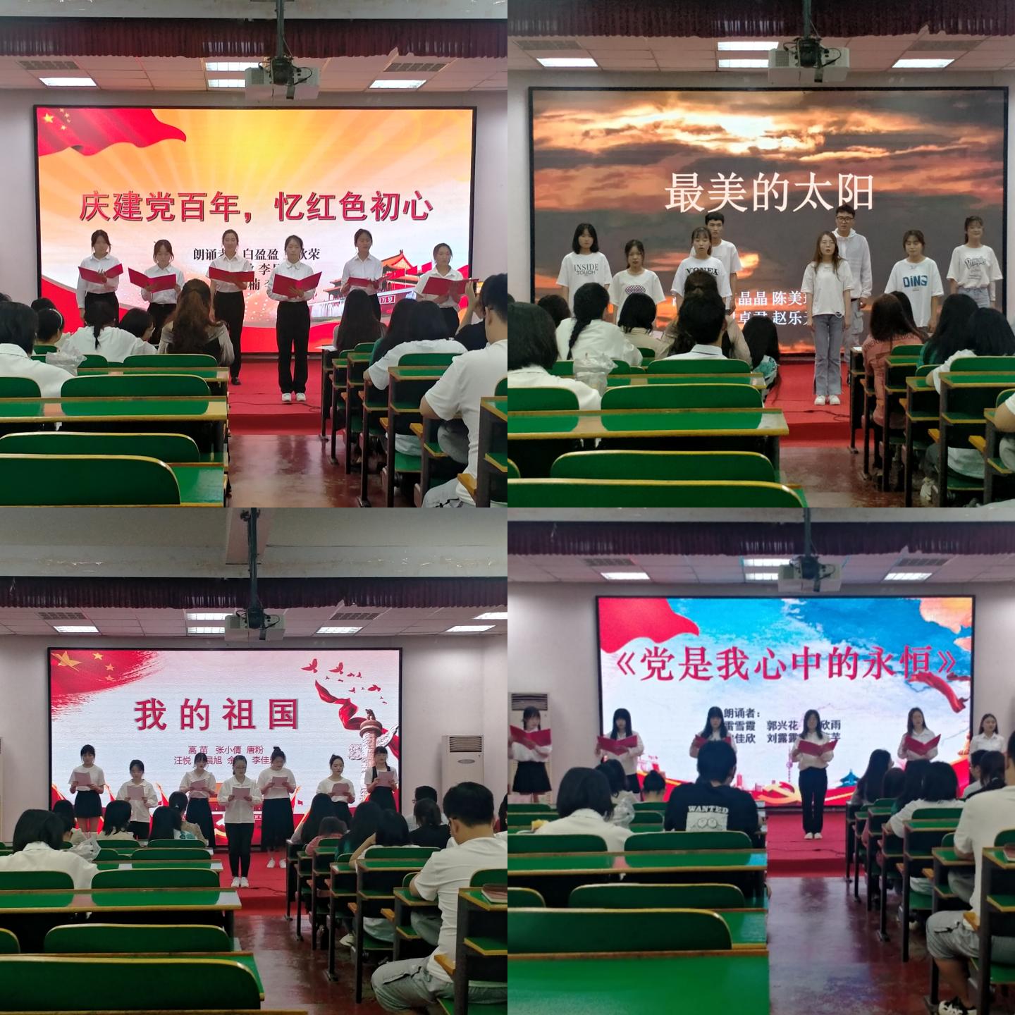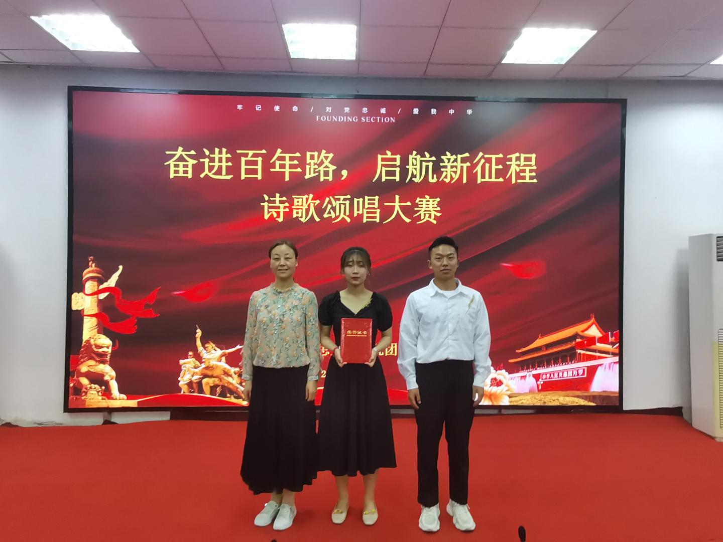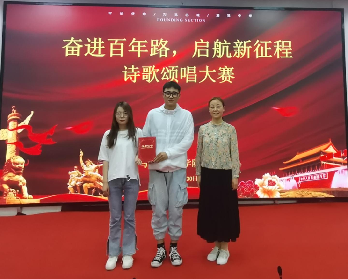 为铭记中国共产党百年奋斗历史,进一步激发员工爱党爱国热情,5月30日晚,公司在一号教学楼报告厅二举行“奋斗百年路,开启新征程”诗歌颂唱比赛。公司党总支副书记刘麦霞,教师高婷婷、高姗姗、李娜娜、刘健出席并担任评委,公司2019级、2020级全体员工参加。此次活动由公司员工郭陈乐、储怡玥主持。