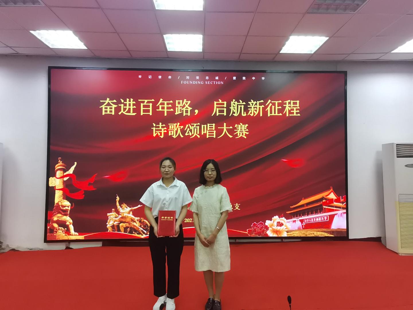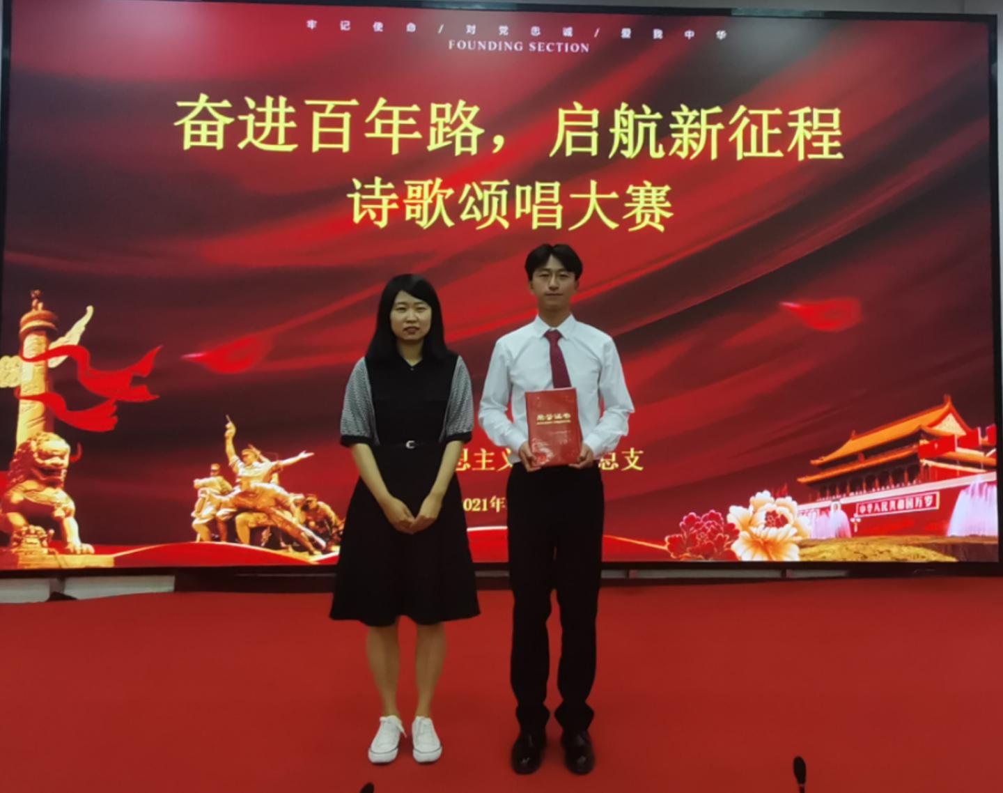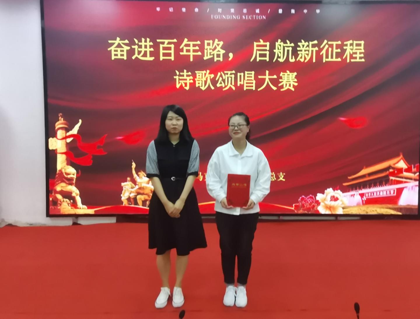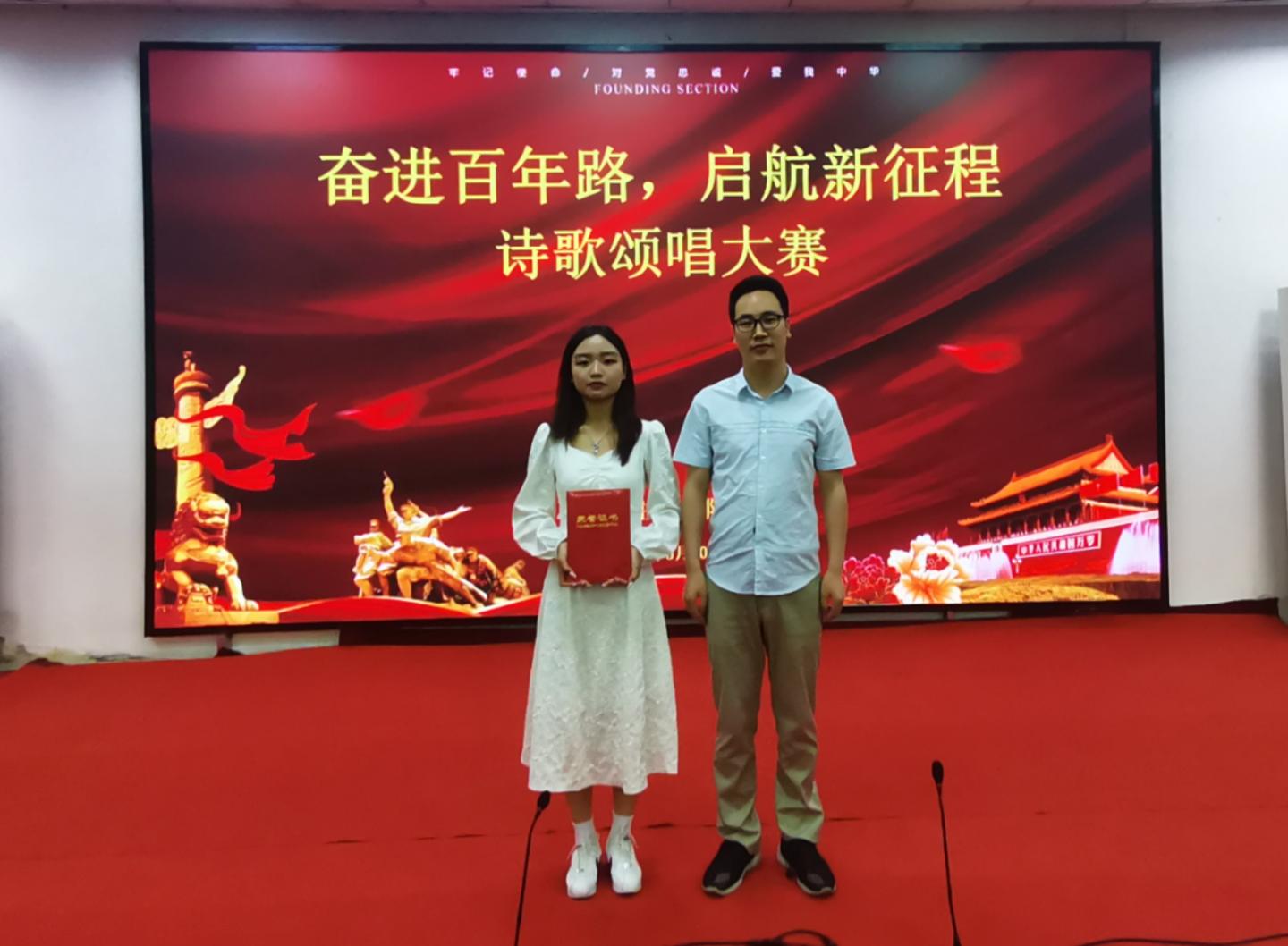 为铭记中国共产党百年奋斗历史,进一步激发员工爱党爱国热情,5月30日晚,公司在一号教学楼报告厅二举行“奋斗百年路,开启新征程”诗歌颂唱比赛。公司党总支副书记刘麦霞,教师高婷婷、高姗姗、李娜娜、刘健出席并担任评委,公司2019级、2020级全体员工参加。此次活动由公司员工郭陈乐、储怡玥主持。