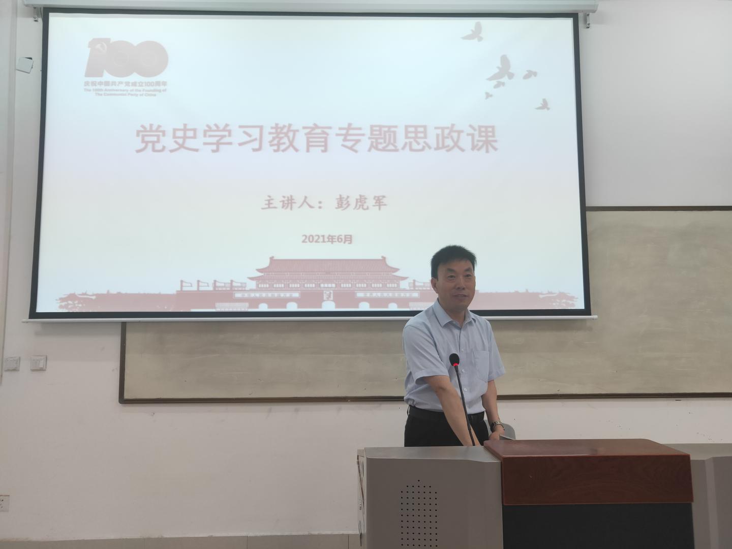 彭虎军在讲授中,带领同学们重温了习近平总书记在党史学习教育动员大会上的重要讲话精神,阐明“学史明理、学史增信、学史崇德、学史力行” 的目标要求,从“深入学习领会习近平总书记关于党史的重要论述、充分认识开展党史学习教育的重大意义;认真研读党史基本著作、全面了解中国共产党百年辉煌;深刻把握党史学习教育的重点;学懂弄通做实习近平新时代中国特色社会主义思想,增强‘四个意识’、坚定‘四个自信’、做到‘两个维护’”等四个方面作了深入浅出的讲解。引导同学们把学党史和悟思想贯通起来,自觉以习近平新时代中国特色社会主义思想特别是习近平总书记关于党史的重要论述为根本遵循,树立正确党史观,准确把握党的历史发展的主题主线、主流本质,理清党史重大事件、重要会议、重要人物,深刻理解“中国共产党为什么能、马克思主义为什么行、中国特色社会主义为什么好”,树立正确的世界观、人生观和价值观,把实现个人价值、奋斗目标、人生理想和国家的前途命运结合起来,坚定理想信念,立大志、明大德、成大才、担大任,努力成为堪当民族复兴重任的时代新人。
