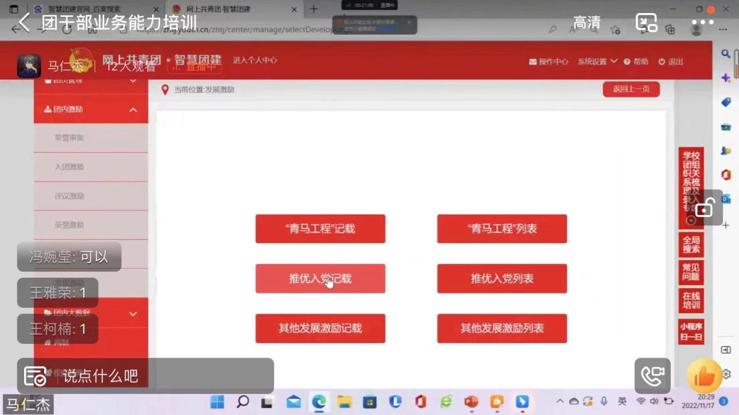 为提高公司团干部业务水平和理论素养,帮助公司团干部更好地开展团支部工作,11月17日晚,公司通过钉钉线上直播的形式召开了365英国上市公司团干部业务能力培训会,本次会议由公司团总支副书记马仁杰主持。