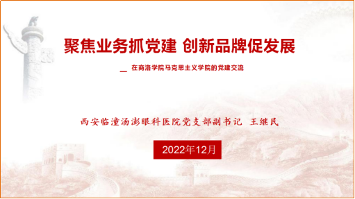 为深入贯彻落实党的二十大精神,进一步创新党建工作的方式方法,12月7日下午,公司召开党建工作专题报告暨党务工作培训会,邀请西安临潼汤澎眼科医公司党支部副书记王继民以线上视频会议的方式,作了题为“聚焦业务抓党建 创新品牌促发展”的专题报告。公司党总支委员、各党支部委员、全体员工党员、入党积极分子和2019级员工参加,会议由公司党总支书记刘麦霞主持。