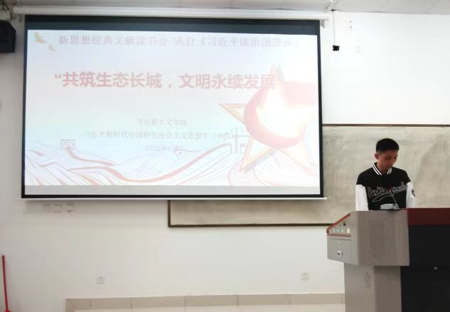 读书会上,同学们观看了习近平总书记关于人与自然和谐共生讲话的视频,深刻领悟习近平生态文明思想所蕴含的人民情怀、文化情怀、生态情怀、民族情怀和天下情怀。宣讲员杨婷带领同学们学习了《习近平谈治国理政》第四卷中关于“努力建设人与自然和谐共生的现代化”的节选内容,进一步深化同学们对党的二十大精神的理解和把握,深入了解习近平生态文明思想的科学内涵。