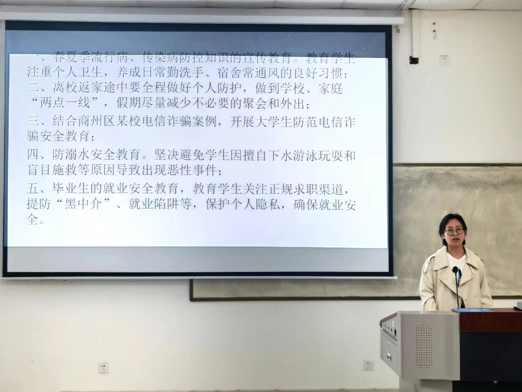 为增强公司员工假期安全意识,提高安全防范能力,4月27晚,公司在8号教学楼多媒体27教室召开了五一节前安全教育班会,公司2020级、2021级,2022级全体员工参加,由团总支书记王然主持。