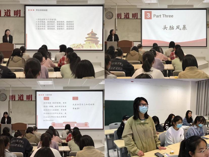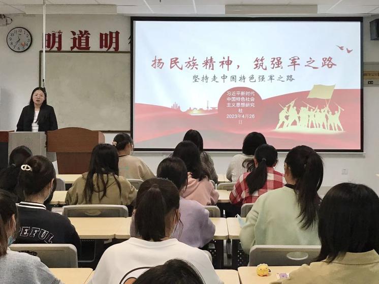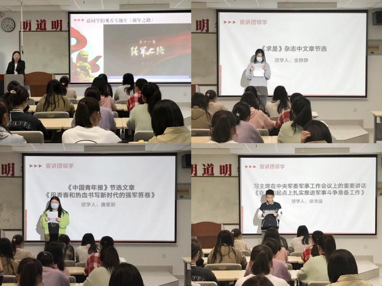活动中,主持人杨婷带领同学们共同观看专题片《强军之路》和视频《强军强国 有你有我》,金静静、唐紫昕等领学了习近平总书记在中央军委军事工作会议上的重要讲话,以及《中国青年报》《求是》节选文章。在知识问答环节,同学们积极思考,踊跃回答问题并交流学习心得。