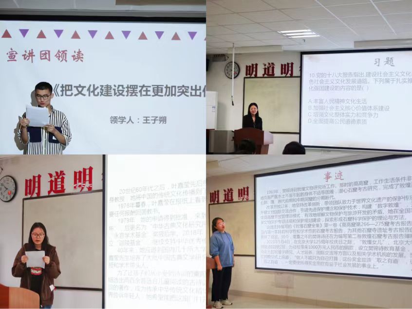 活动中,主持人杨婷带领大家观看新闻联播选段,宣讲员王子朔、杨嘉乐等领学了《习近平谈治国理政》第四卷“把文化建设摆在更加突出位置”,并讲述樊锦诗、叶嘉莹在文化建设中的先进事迹。在知识竞答环节,同学们积极思考,踊跃发言,现场气氛活跃。