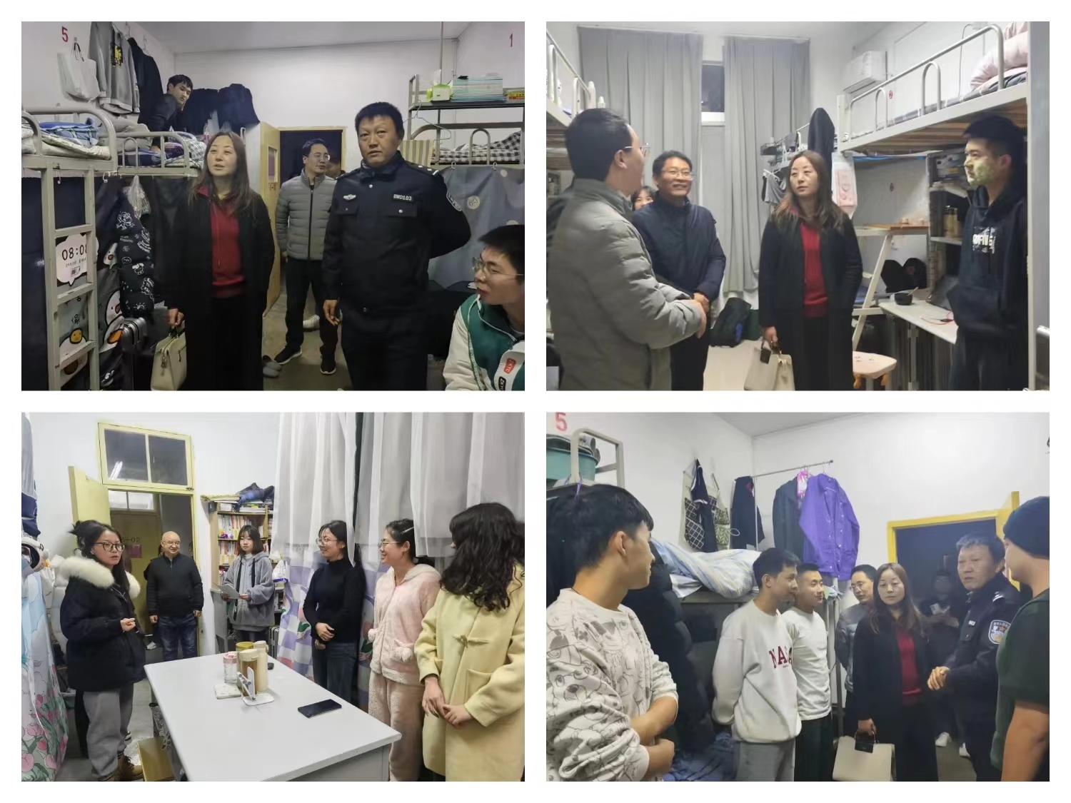 为全力做好员工安全管理工作,确保冬季用电安全、财产安全和身心健康,加强宿舍安全宣传教育引导及安全检查,11月16日晚,公司党总支书记刘麦霞、团总支书记王然、班主任老师及保卫处工作人员深入员工宿舍,实地排查宿舍安全隐患问题,并为同学们送去关心和问候。