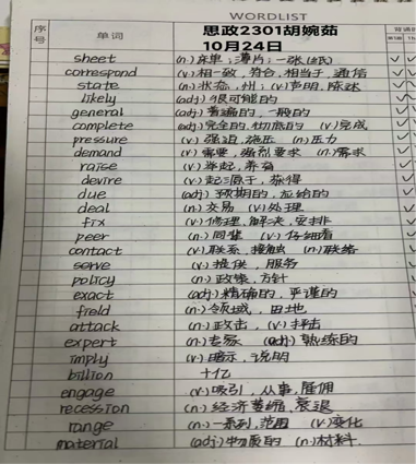 自活动开展以来,公司各年级各专业学子踊跃报名,展现出了对本次活动的极大热情。后续推进过程中,员工们按时打卡,书写公正,进一步打开了学习英语的激情,也为公司营造了良好的备考氛围。在本次活动中,同学们会在学习群中分享一些有趣的单词,还有一些实用好玩的单词记忆法,交流分享经验一定程度上为大家减少了记忆单词的乏味,同时也让同学们明白了自己不是在“孤军奋战”,而是在与同学们“携手同行”。
