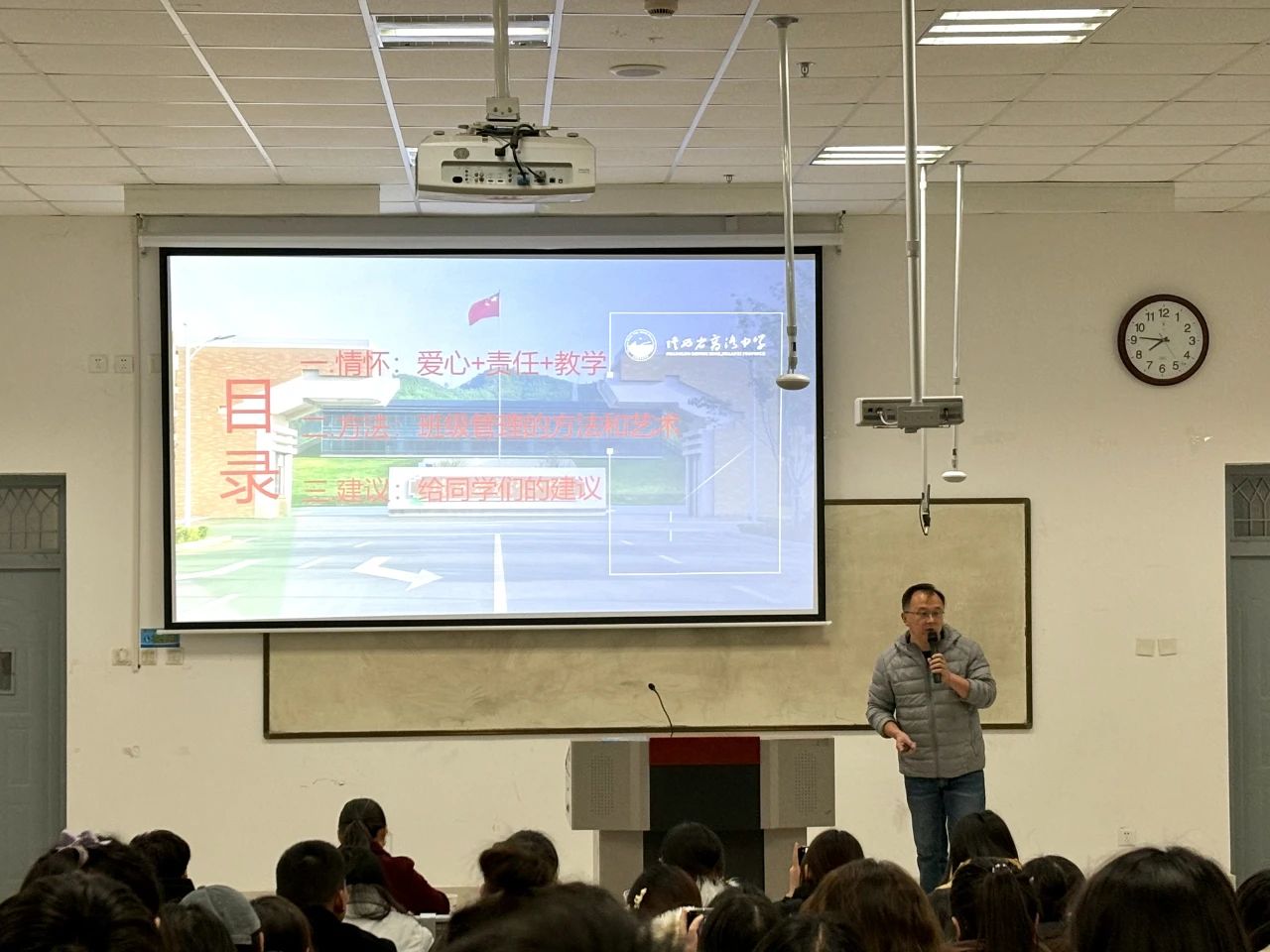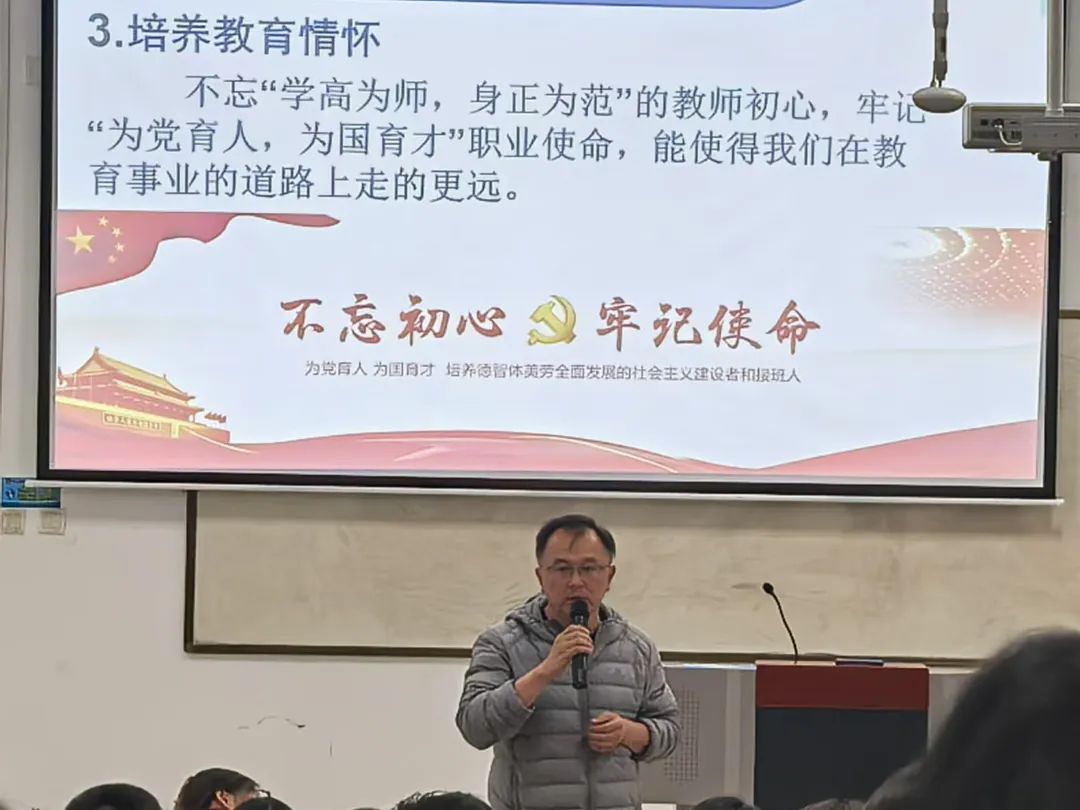 本次报告中,阮涛老师着重从三个方面进行教育见习。一是爱心责任教学,为同学们分析如何成为一个有责任,有爱心,有能力的班主任以及强调,如何在爱的教育中,获得作为老师的充实与幸福,提升职业幸福感。二是班级管理的艺术和方法,阮涛老师分享历年做班主任的工作经验,班级的日常管理,如何更好的处理班级内的大小事务,为同学们日后的班级管理提供了丰富的经验,宝贵的方法。三是给同学们的建议,“十年树木,百年树人”同学们应该,多读书,培养教育情怀,强调应遵循,不忘"学高为师,身正为范"的教师初心,牢记"为党育人,为国育才"职业使命,做一个有情怀的教育者,使同学们在职业道路上走得更远更稳。